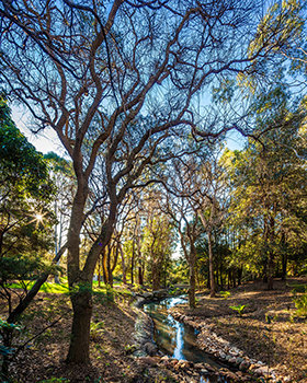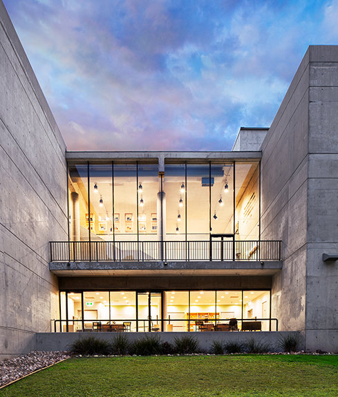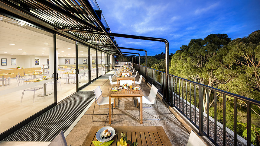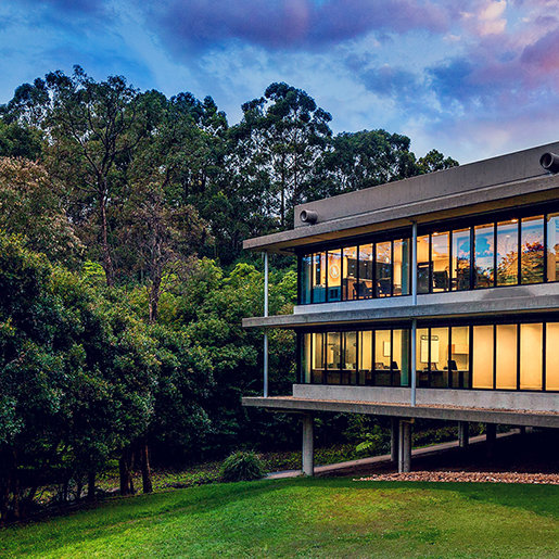 The ultra-modern structure presents a minimalist style with multi-story glass blending into a striking concrete landscape. Outside, the Blue Gum Creek wends its way through the 8.5-acre eucalyptus forest, a virtual Garden of Eden in the heart of Sydney’s metropolitan area.