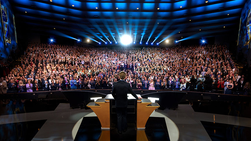 The evening began with a thunderous standing ovation greeting Mr. David Miscavige, the ecclesiastical leader of the Scientology religion, as he stepped to the stage and set the tone for what lay ahead.